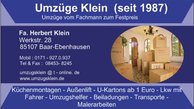 Umzüge Klein( seit 1987) - unsere Leistungen auf einem Blick: Europaweite Transporte mit qualifizierten Möbelpackern und Küchenmonteuren Außenlift bis 5. Etage oder 15 m Höhe (auch Vermietung) Klaviertransporte Für Selbstumzieher: LKW mit Fahrer & zugleich Packer Ein -& Auspackservice Unschlagbar! Umzugskartons ab 1,- €uro Kleiderkartons , Aktenordnerkartons,Bücher-und Geschirrkartons Seidenpapier & Luftpolsterfolie Lampenmontagen &Vorhangstangenmontag Wohnungsauflösungen